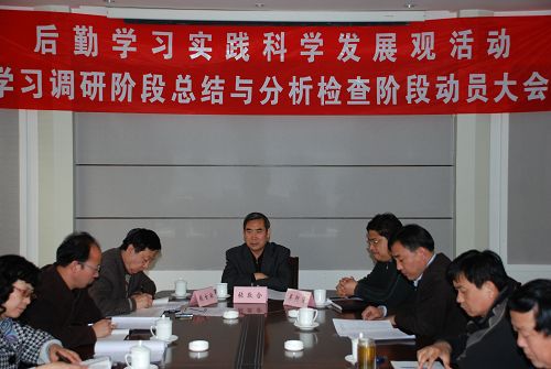 后勤党委书记张士壮对后勤第一阶段学习实践活动开展情况进行了全面总结,肯定了前段活动取得的成绩,指出了后勤学习实践活动需要改进的问题。要求后勤领导班子成员在分析检查阶段要率先垂范,认真开展谈心,广泛征求意见,做好领导班子民主生活会的准备工作,形成书面发言材料,开好领导班子民主生活会;组织好群众评议,不断完善形成后勤高质量的分析检查报告。各党支部书记要把学习调研贯穿活动始终,继续组织党员学习好科学发展观理论规定书目及中央、省委、学校领导重要讲话精神,开好支部组织生活会,并把学校“双评一讲”有机结合到学习实践活动中;继续抓好宣传工作,注重正面引导,总结经验,营造后勤学习实践活动良好氛围。